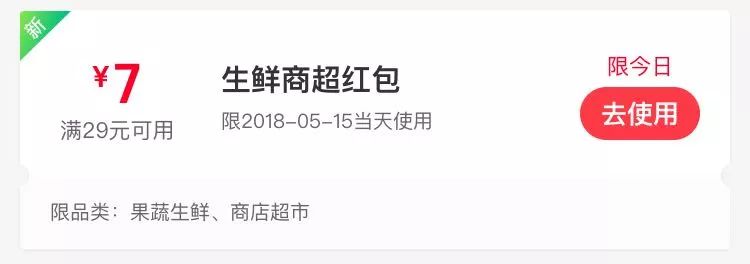 这个券的限制是只能用于购买生鲜,正常来说会在券的详细解释中告诉用户怎么去生鲜超市:1.回到首页;2.点击“生鲜超市”。
