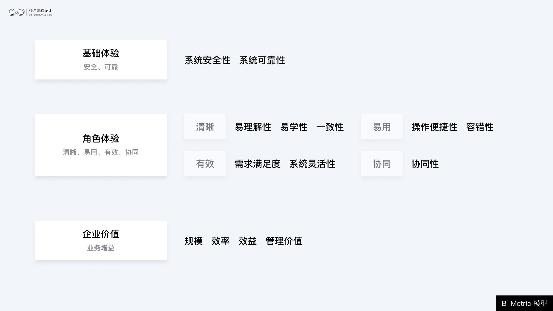 B-Metric是一个关注业务特点与用户角色的度量模型。从度量目的出发,总结出B端产品最关注的问题是系统的质量与安全、核心任务流的使用体验以及企业效率效能的增益。由此确定了基础体验、角色体验、企业价值这三大度量指标。
