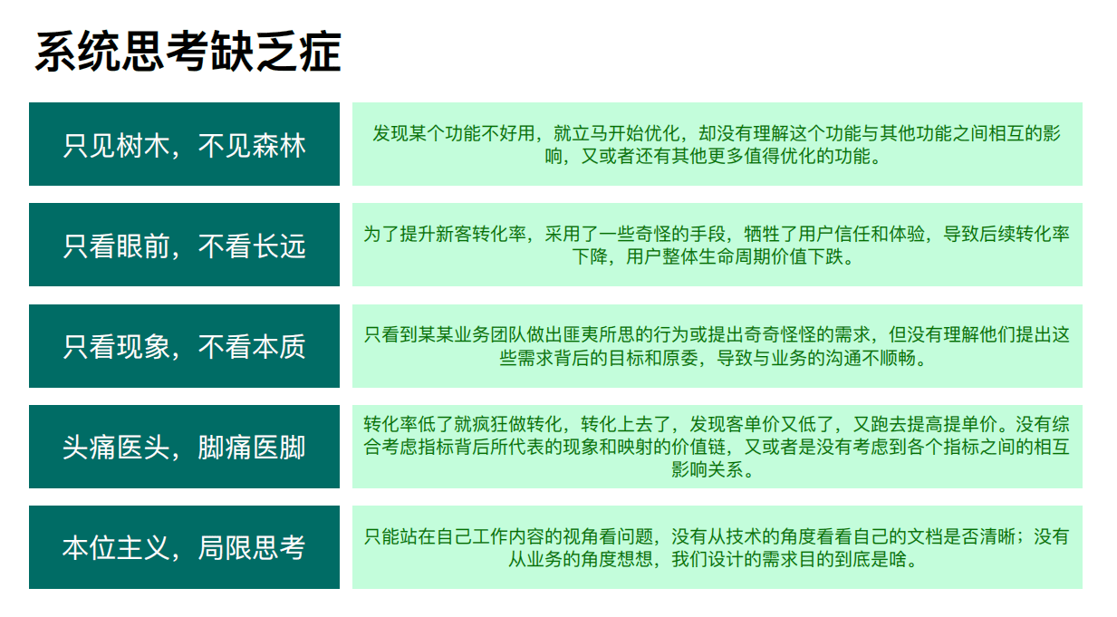 在产品工作中也一样,比如去年双十一奏效的活动方案,因为用户态度和环境的变化,今年可能就完全行不通了。我们所遇到的问题通常都不是彼此孤立的,而是相互影响、动态变化的,尤其是在由一系列复杂系统构成的动态情境之中。产品经理不能只是解决表面问题,而应善于理解系统的结构和管理混乱的局势。