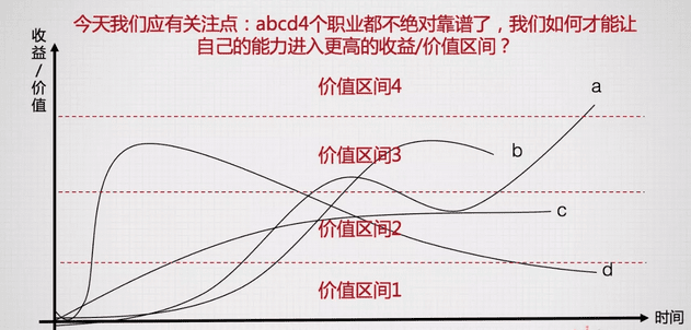 因而,我们在过去的时代把所有的可能都赌博式的押宝在“如何选对一个好职业”上的做法,到今天可能需要改变了——我们可能更应该关注:哪怕频繁切换职业赛道,我们怎样才能确保自己还能持续习得更有价值的能力,放大个人价值,确保自己可以进入到更高的价值区间?(如下图)
