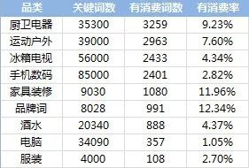 例如,某电商类客户,罗列出了各品类的关键词基础数据(如下图)。通过数据对比,词量占比最多的是手机数码类。这是否是企业主打品类呢?