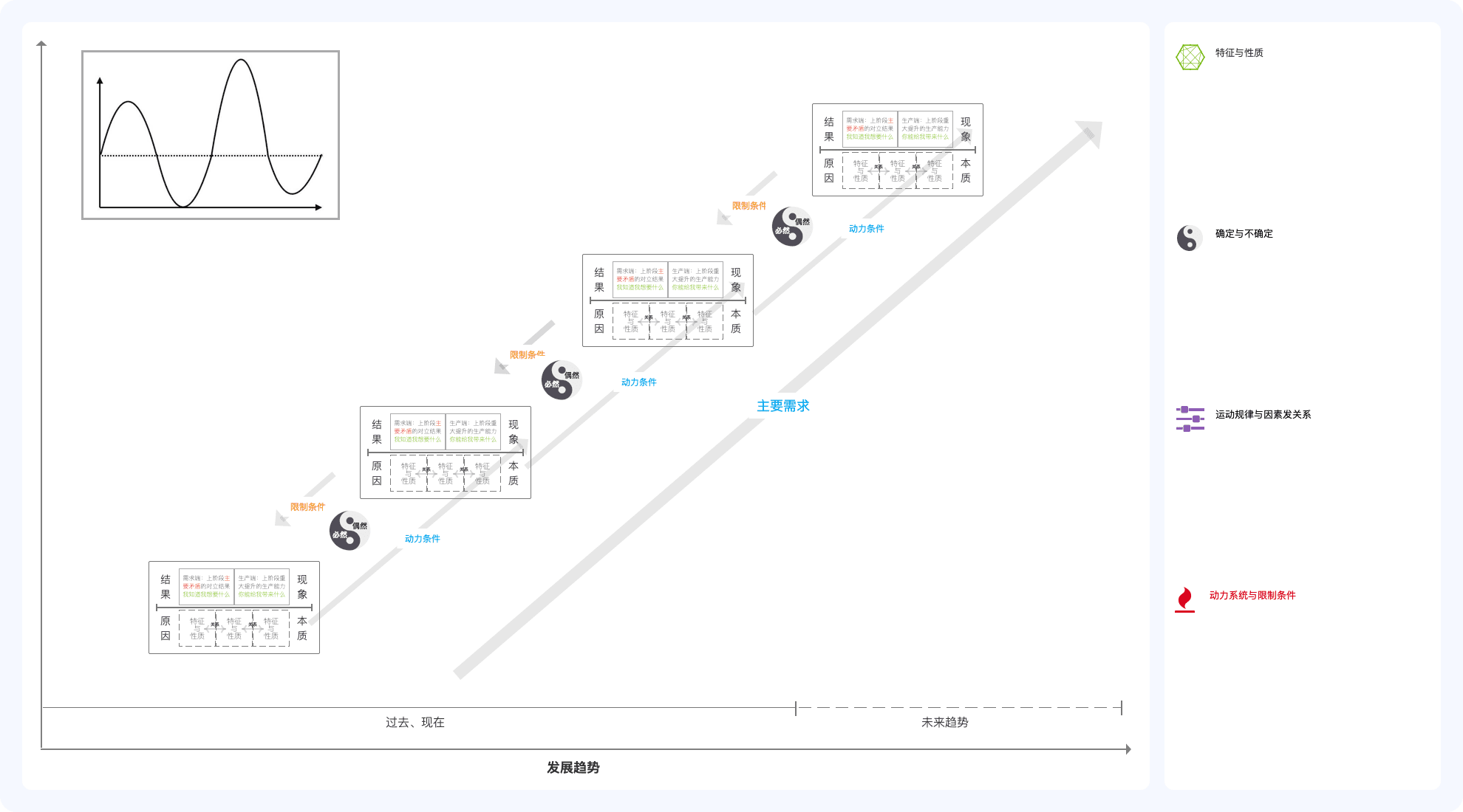 (4)发展趋势:发展规律是底层的,发展趋势是显性的,抽象为阶段性的。