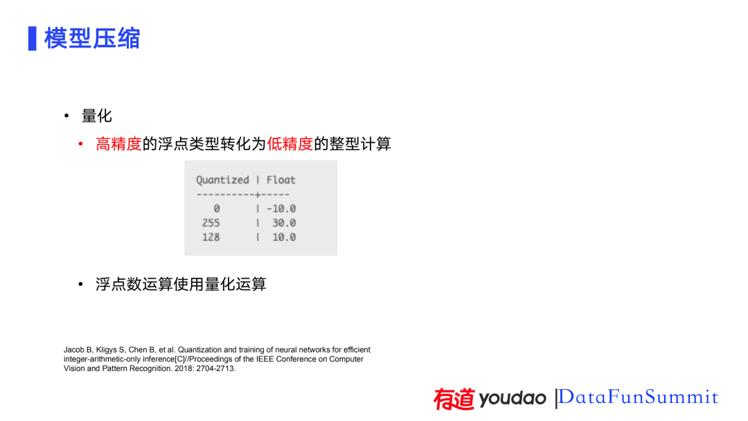 此外,还进行了一些模型量化的工作。在训练中,大部分使用浮点数进行训练。浮点数Float有4个字节,但高精度的浮点类型不是很有必要,可将其转化为低精度的整型计算。我们采用了线性映射的方式进行转换,比如:将浮点类型-10到30的区间映射到为0到255之间,0代表-10,255代表30。将浮点数转化为低精度整型计算后,整个浮点数的计算也是使用量化运算的,这块参考了谷歌的计算方式。