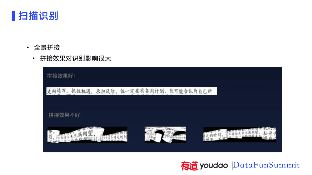 全景拼接是扫描识别中最重要的步骤。这一步骤要从拍摄的100多张图像中找到要识别的文本行。好的拼接算法对后续识别的影响很大。如果拼接的不好,如PPT下侧的示意内容,后续的识别算法也很难得到正确的输出。