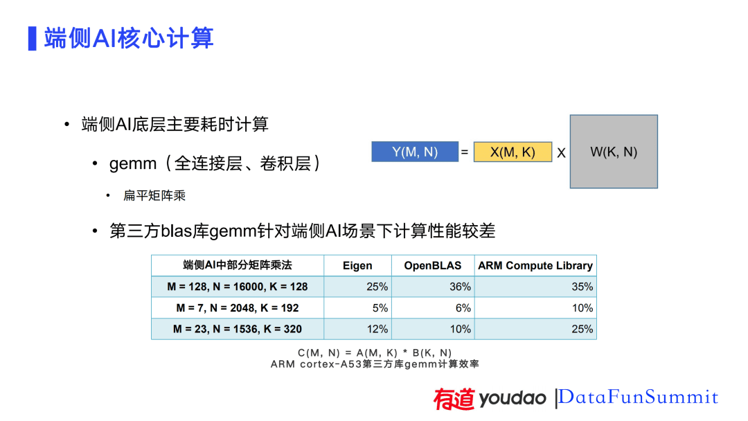 从计算角度来看,端侧AI计算主要耗时集中在底层的矩阵层计算中。从神经网络角度来说,卷积层很多情况下可以转换成矩阵层计算的形式。云端计算时可以通过Batch将矩阵层变为一个比较大的矩阵。但在端侧一般都是单用户的请求,往往是一个扁平矩阵的乘法。如PPT中右图所示,端侧AI计算时的输入矩阵或中间矩阵是一个行很小(几到几十)列很大(可能几千到几万)的矩阵,称其为X。X与一个与正方形矩阵或长方形的权重矩阵相乘得到一个扁平矩阵。在矩阵层有很多第三方Blas库,但作为一个通用库,Blas在优化的时候对常规的矩阵优化性能比较好,但对端侧AI场景下的矩阵计算性能表现一般。我们选择了三种矩阵尺寸,在Eigen、OpenBLAS和ARM Compute Library库中做了性能测试,数据显示在ARM cortex-A53芯片中计算效率都比较低,有的甚至不到10%。考虑到端侧芯片的性能本身相对比较差,而计算又不能充分发挥芯片的性能,这给部署带来了更大的挑战。