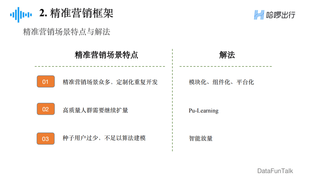 通过前期的数据分析和调研发现,目前哈啰精准营销的场景特点和我们针对性的解法主要有以下三方面: