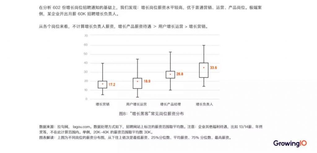 从GrowingIO公司对拉勾网602份增长岗位的分析,可以看出增长岗位大概的一个薪资范围,也可以看出,互联网公司大部分岗位都在裁员,唯独增长岗位非但不裁,而且工资还在上涨。