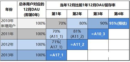 因此,预估2014年中老用户的DAU留存,则根据前1年的留存率预估下1年(实操时,通常为了对业务提出更高要求,留存率会要求小幅上涨),如上图最后一栏的公式。