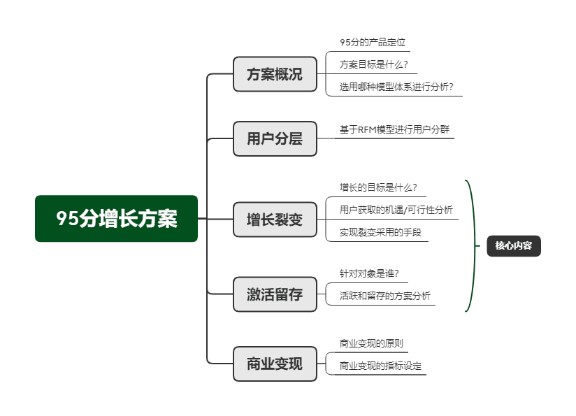 本文针对95分的增长方案主要分为五大内容,上图是本文的大纲&思维导图,下面笔者将每一部分内容展开讲述。