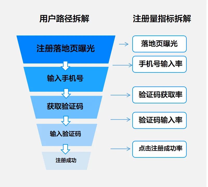 2)建立漏斗还是以注册为例子(注册方式:手机号验证码),注册流程按用户路径可以拆解指标如下: