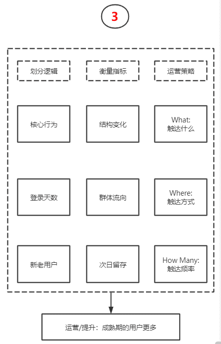 - 如何衡量:从总体看用户结构变化以及群体的流向以及次日留存情况,从单个的触达来看触达的效果指标。