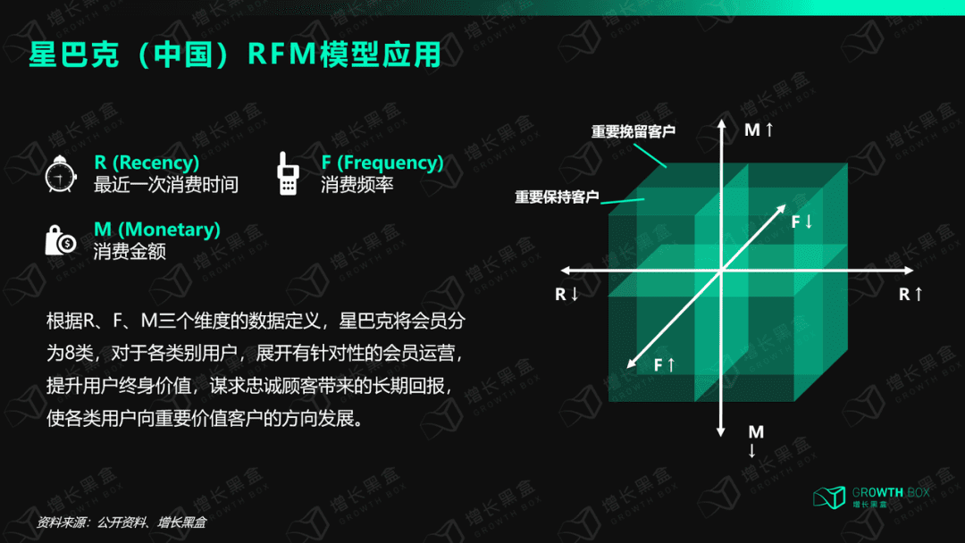 以此参数对照星巴克,为了达到“更多人”的目的,其主要举措是拓展会员增量;为了实现“更高额购买”,星巴克通过搭建会员系统,依靠RMF模型和私域运营来激活存量会员来提升用户价值。