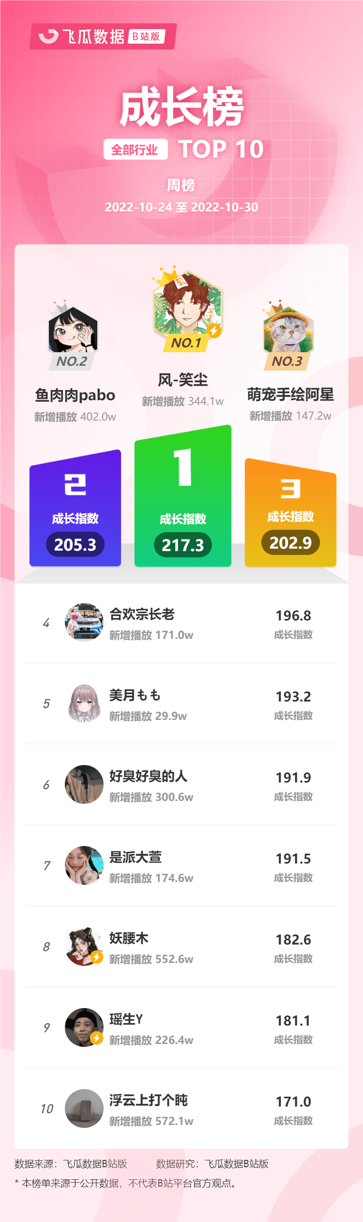 成长排行榜(B站平台)-全部行业中“风-笑尘”排名第一,成长指数217.3;“鱼肉肉pabo”排名第二,成长指数205.3;“萌宠手绘阿星”排名第三,成长指数202.9。
