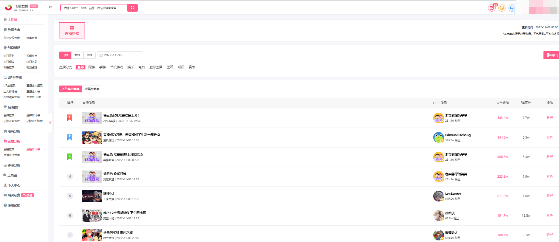 1.直播人气榜,可按up主分类、直播分类、日榜、周榜、月榜查看直播人气排行数据