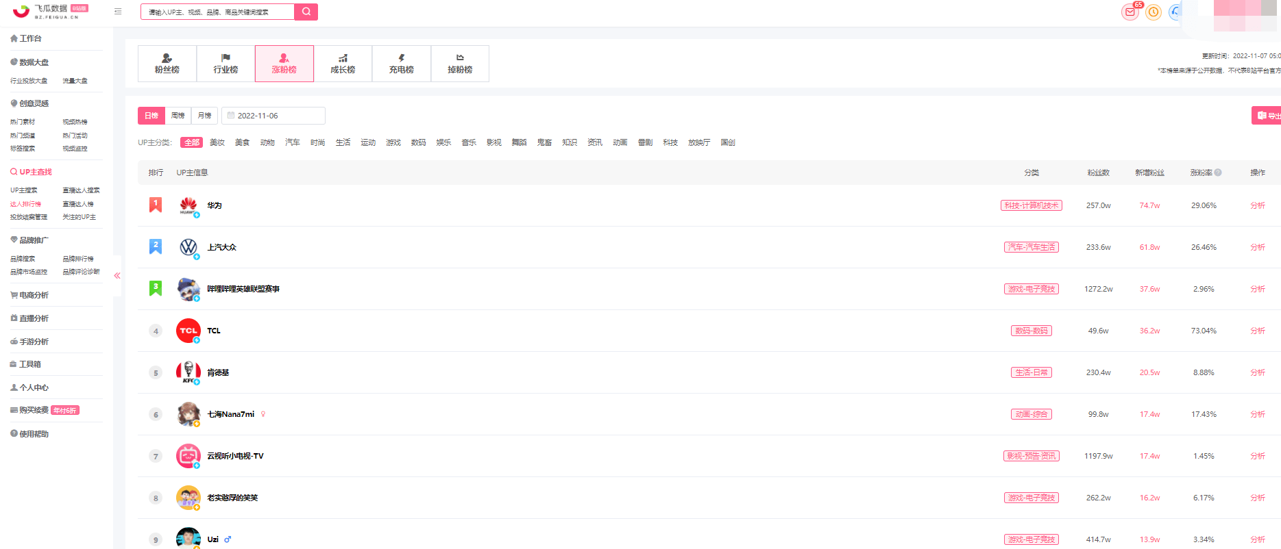 总结:借助第三方数据分析平台查看各榜单数据,能够更便捷地知晓b站各榜单排行数据,便于我们发现优质有潜力up主、品牌等,实时掌握b站各up主数据动态。
