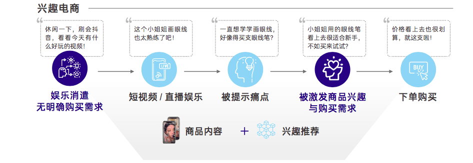 而这“兴趣电商”则是通过内容激发消费兴趣,典型的消费路径是“兴趣-需求-购买“。首先通过内容推荐识别用户兴趣,再基于用户对商品内容的持续关注,激发商品使用期待和情感共鸣,从而创造消费新动机,带来新生意增量。