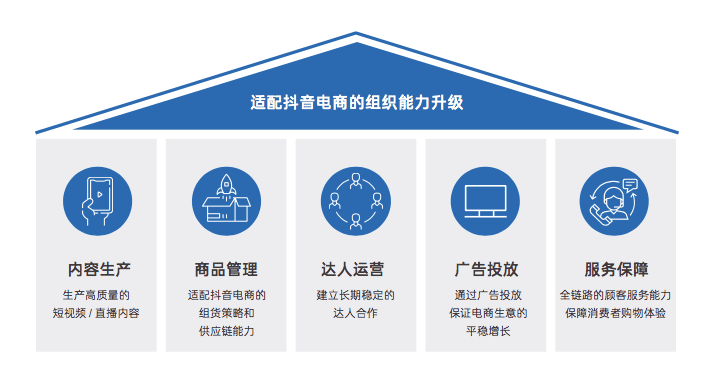 想要领跑抖音电商,商家可以从内容、商品、达人、广告、服务五大基础维度出发,升级组织架构。