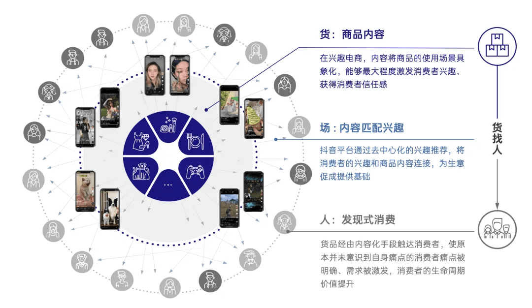我们可以从【人-货-场】的角度出发重新解释一下兴趣电商。我们一直在说兴趣电商最核心的点在于,对「交易场」进行了重构——从原来人找货的形式变成了货找人,通过内容去匹配兴趣,激发消费,这是我们对场的重塑。除了对于场的重塑以外,其实还有两个点:货和人。