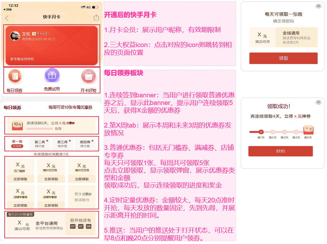 - 为实现提高商城用户活跃度,设计快手月卡板块,包括每日领券、免费试用、月卡好物等三大权益及其实现方案;