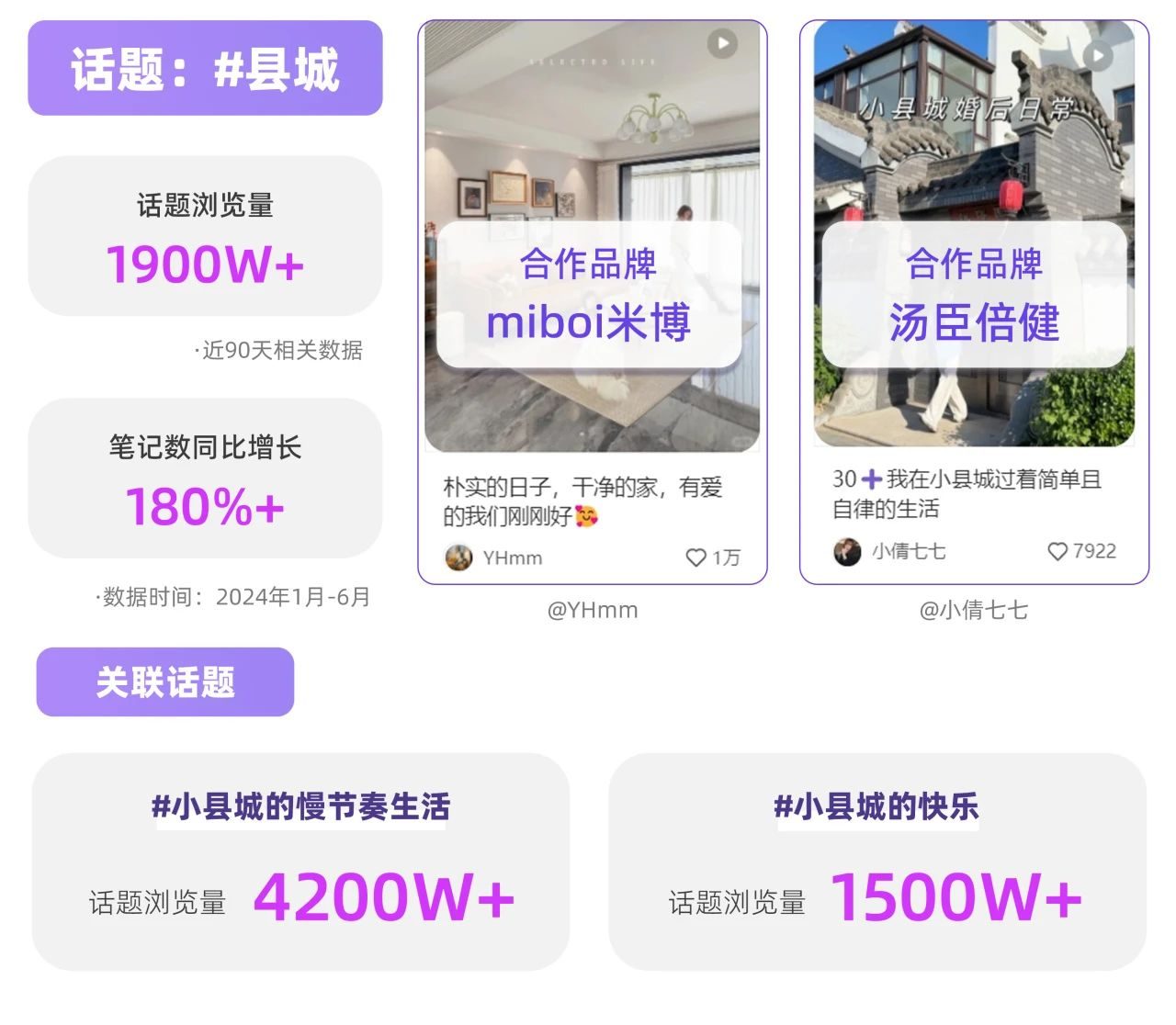 千瓜数据显示,#县城 近90天话题浏览量1900W+,关联话题#小县城的慢节奏生活、#小县城的快乐等,季度平均浏览量均破千万。2024年上半年,「县城」相关种草笔记数同比增长180%+,提及品牌涉足:美食饮品、出行工具、服饰穿搭、家居家装等,多行业都已进入县城内容场。