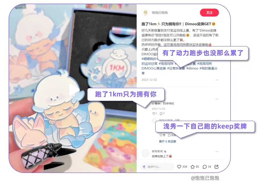 无独有偶,推崇“自律即自由”的Keep,推出设计精美的奖牌帮助用户坚持有规律地跑步,“有了动力跑步也没那么累了”、“跑了1km只为拥有你”……所采取一系列“奖励式”的机制不断建立产品的使用粘性,让用户感知到“坚持健身不是一件难事”。建立牢固的品牌心智后,keep在推出健身相关的食品、设备、服饰时,用户也更易于接受,keep也从一款简单的“运动软件”升级为从各个方面帮助用户坚持自律生活的品牌。