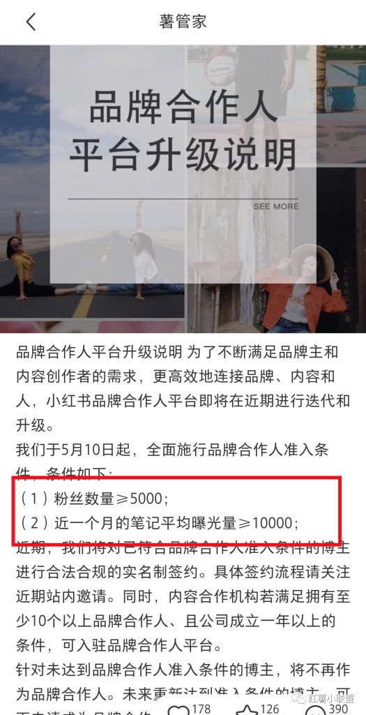5月10日,小红书官宣品牌合作人平台升级,合作人准入门槛陡增,粉丝量≥5000,笔记月平均曝光量≥10000。