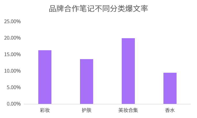 品牌合作笔记中,4个笔记类型爆文率均在10%以上。合集类笔记的爆文率较高,但彩妆和护肤类的笔记爆文数量远高于其他分类。