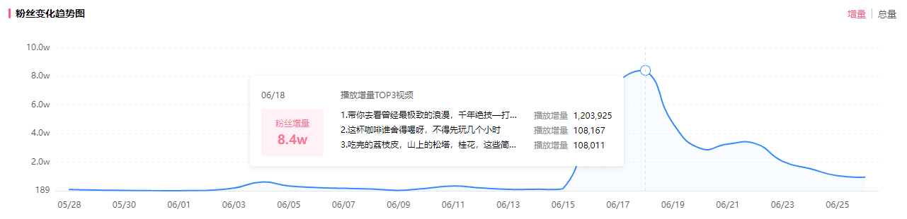观察其账号粉丝变化趋势图来看,6月18日当天涨粉上升到一个峰值,单日粉丝增量高达8.4万,近15天内新增50万粉丝数,无疑是达到了“爆”的标准。