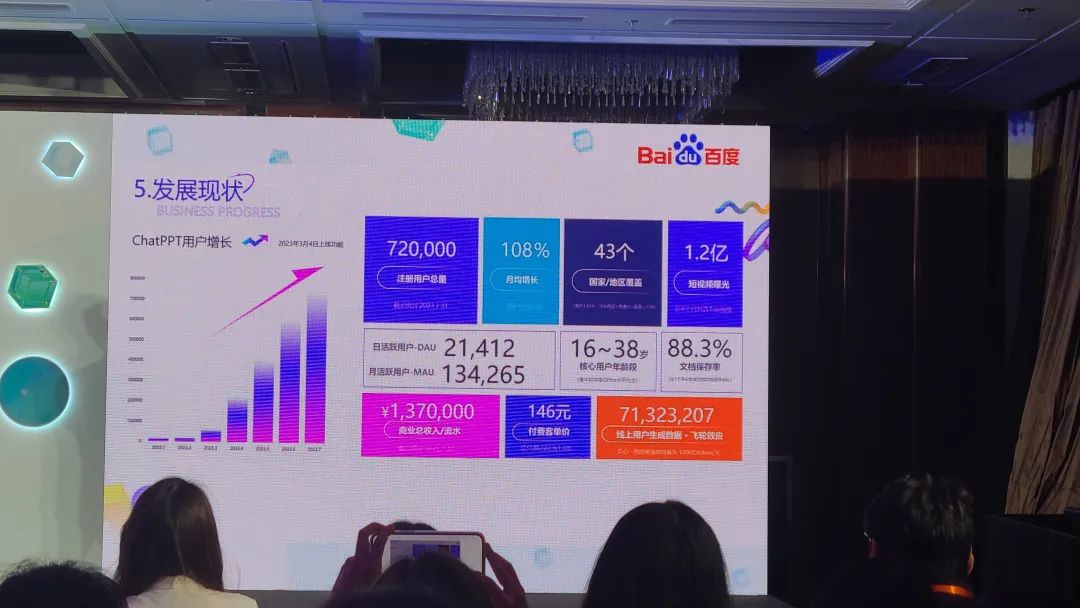 ▲ 大赛路演项目ChatPPT运营数据事实也证明了,只有这样的产品才能被市场认可。据其创始人路演中讲道,目前ChatPPT产品用户量正在指数级增长,注册用户量近72万,付费平均客单价约146元,产生商业总流水近1300多万人民币。