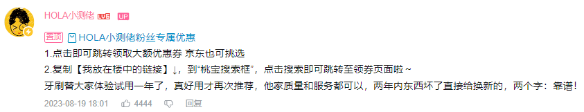 除此之外,UP主还在评论区置顶蓝色链接,一方面方便潜在兴趣用户能够通过该链接跳转消费并获取到UP主专属优惠链接,另一方面为产品补充说明,以文字的形式强调“两年内坏了直接换新”的售后福利。