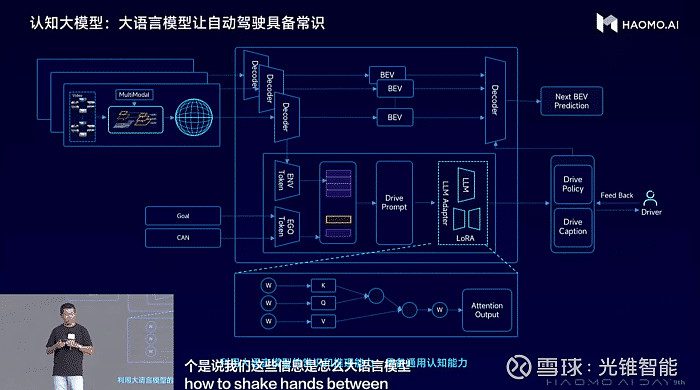 由于大语言模型已经学习到并压缩了人类社会的全部知识,因而也就包含了驾驶相关的知识。经过毫末对大语言模型的专门训练和微调,从而让大语言模型更好地适配自动驾驶任务,使得大语言模型能真正看懂驾驶环境、解释驾驶行为,做出驾驶决策。认知大模型通过与大语言模型结合,使得自动驾驶认知决策获得了人类社会的常识和推理能力,也就是获得了世界知识,从而提升自动驾驶策略的可解释性和泛化性。
