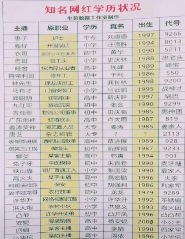 从李佳琦到薇娅,从辛巴到小杨哥,从倪海杉到海参哥,学历普遍不算高。