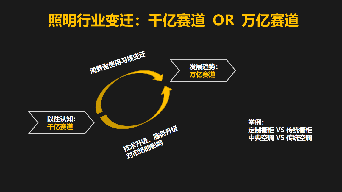 随着智能化的演进,照明行业存在很大概率,从过去千亿级赛道变成一个万亿级的赛道。它不应该仅仅是买一个灯泡在自己家里装上,更应该是由专业人员跟你沟通,为你的家量身定制的过程,照明产业完全可以变成一个非常大的行业。