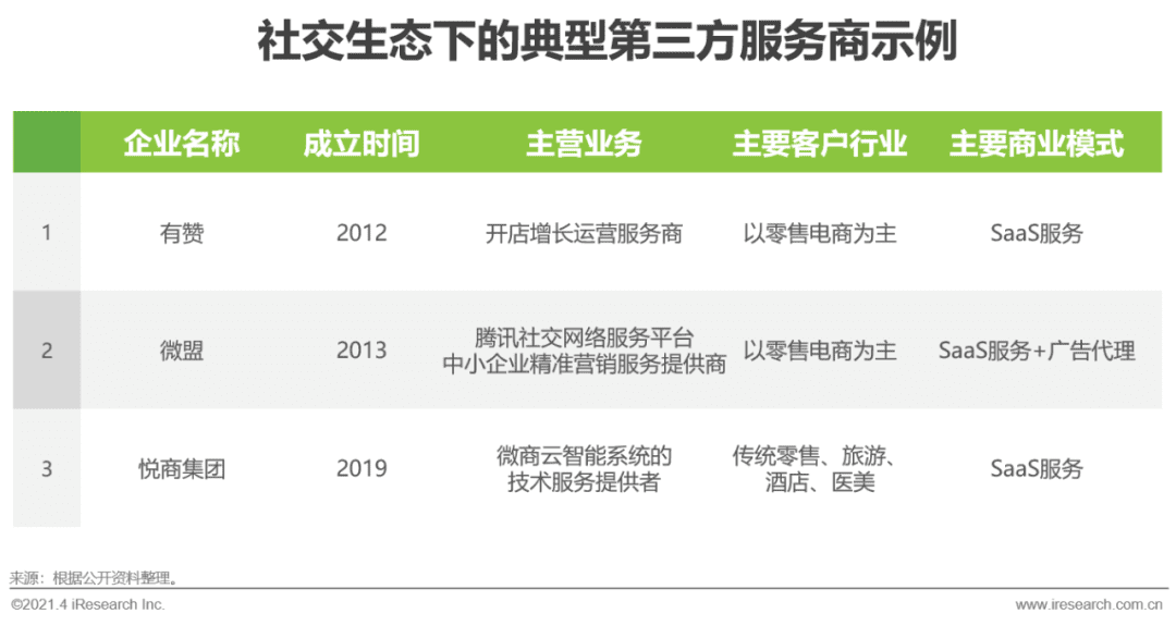 从产业视角来看,社交生态下微商市场的快速发展,除了为社交生态平台、品牌商户和消费者带来更多商业价值之外,也将催生出更多的赛道创新机会,尤其是提供第三方服务的相关企业,如有赞、微盟、悦商集团等。对平台方来说,在微商布局推进中需要大量第三方服务商帮助其挖掘创新模式与玩法,加速布局的推进和生态的成熟。对企业和从业者来说,也需要更多的赋能与支持,帮助其快速熟悉微商模式,实现更加高效和规范的销售与交易达成。