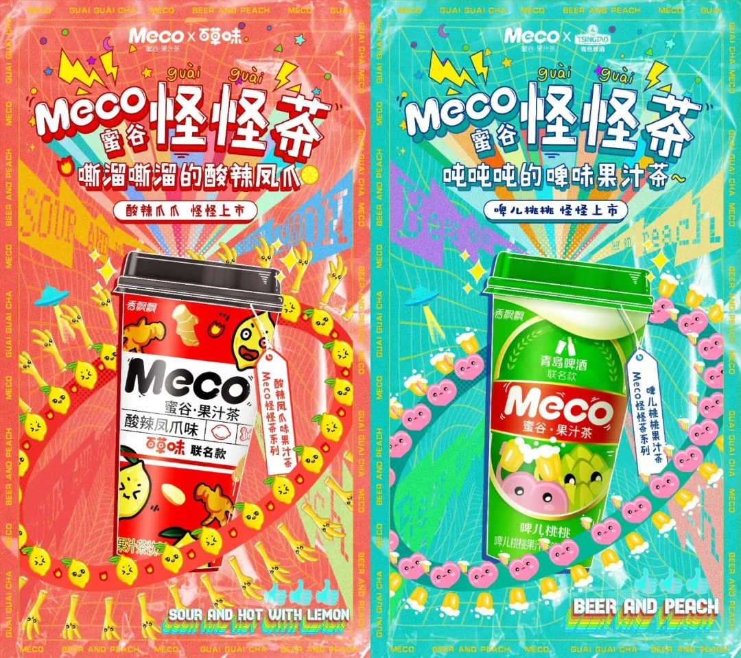 Meco蜜谷果汁茶联合百草味、青岛啤酒分别推出的酸辣凤爪味和啤酒风味Meco蜜谷怪怪茶系列,既满足年轻人的好奇心,又自带传播话题。而女神节限定款Meco果汁茶桃花女儿红、桃花状元红,圣诞节红绿包装的Meco蜜谷果汁茶限定款,也进一步细分节日饮用场景,让惊喜新鲜的体验感无孔不入。