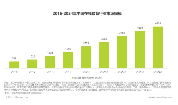 近年来,人们的教育培训需求增长,疫情冲击下加快了教育行业线上化转型的步伐,线上教育成为了教育行业的主流趋势,根据艾瑞咨询数据显示,2020年中国在线教育行业市场规模达2573亿元,2021年预计达到3082亿元。
