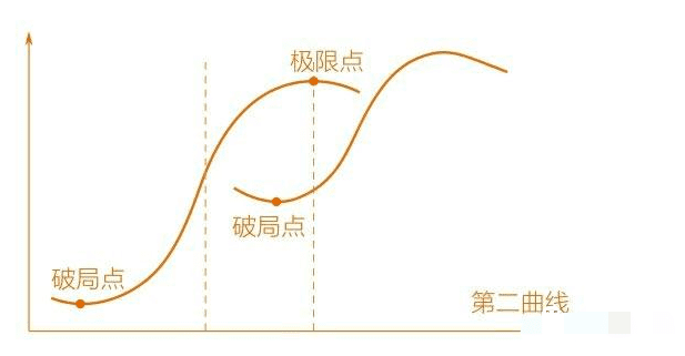 “西格玛曲线”也很形象的预示着万事万物的一个发展过程,不管是一家企业、一个行业、一项技术、或者某个流行一时的东西,大多都会遵循这条曲线的轨迹,先是缓慢积累、然后爆发、遭遇瓶颈、最后衰落,同时这种曲线只会延长,并不可逆。“第二曲线”则是在“西格玛曲线”的基础上,提出在第一条曲线还未走向衰落时,便开启第二条曲线,这样即使之前的曲线不免衰亡的命运,依旧会有下一条曲线接上来。