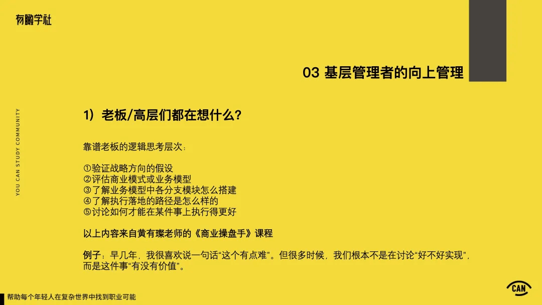 例如:黄有璨老师的操盘手课程里讲到,靠谱老板的逻辑思考分为5个层次,不同层次的高度是不一样的。因此要在实际上运用和老板的思考同频的话,还有很多工作要做。