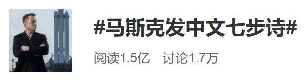 马斯克这条推文被转发了2.5万次,收获2.8万条评论,13万个赞。在微博上,#马斯克发中文七步诗#的微博话题也引发了1.5亿的阅读热度。同时还有多个相关话题登上微博热搜榜。