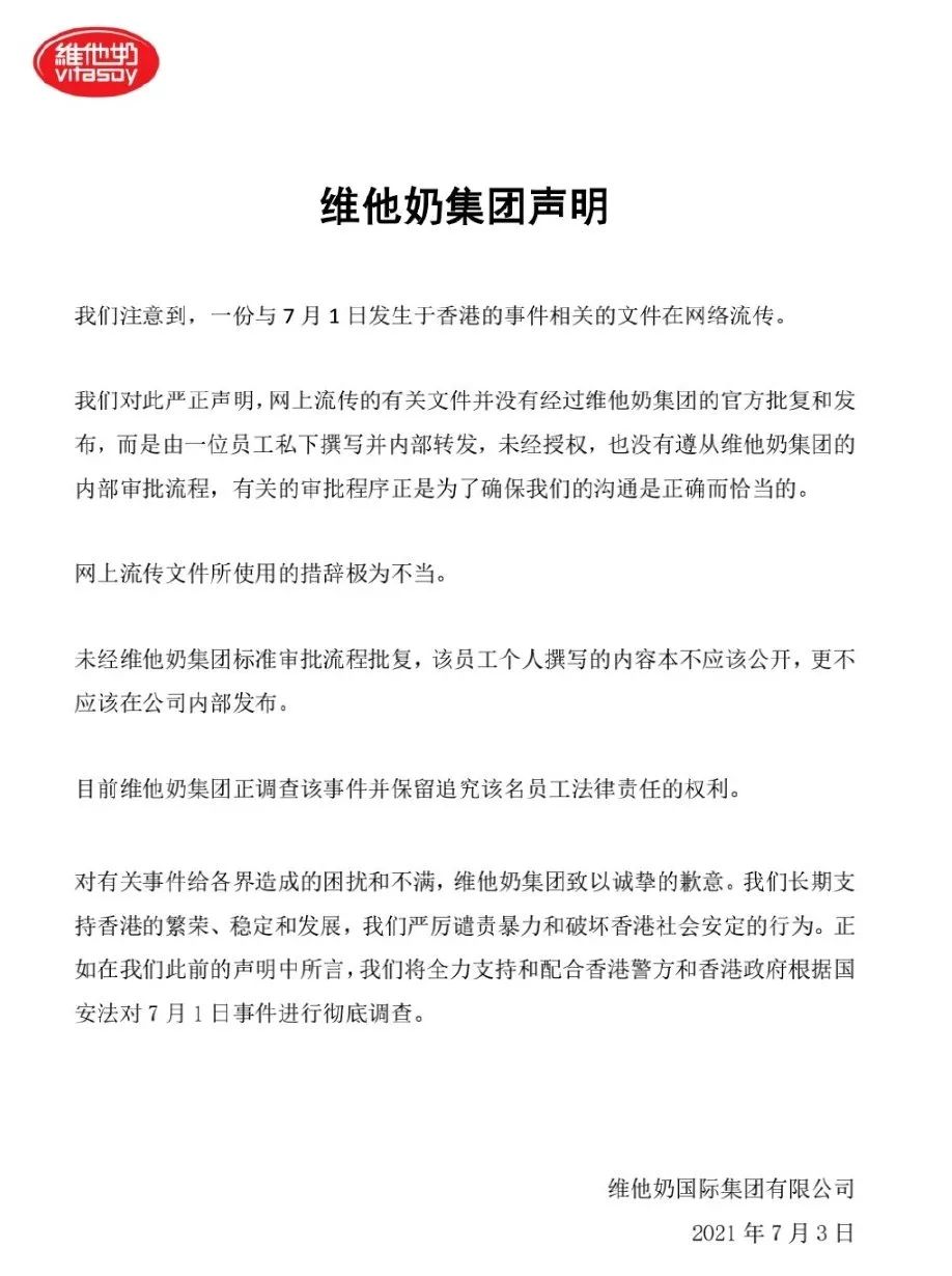 7月3日凌晨,香港饮品公司维他奶国际集团的内地分部“维他奶有限公司”在其品牌官微发布声明。