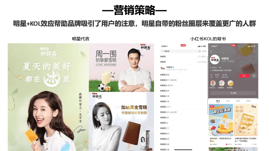 在品牌营销上,钟薛高通过 “快闪店+线下门店”,吸引众多消费者来线下打卡,为用户开启互动式品牌体验。不仅实现了线下联动售卖,还能通过各种主题活动将话题引导至线上朋友圈,形成了打卡、分享、引流的闭环,并进行裂变,扩大了钟薛高的品牌声量。同时以跨界联名的方式,让创意碰撞,实现多圈层的触达。最不能少的当然是“明星+KOL”效应帮助品牌吸引了用户的注意,明星自带的粉丝圈层来覆盖更广的人群。
