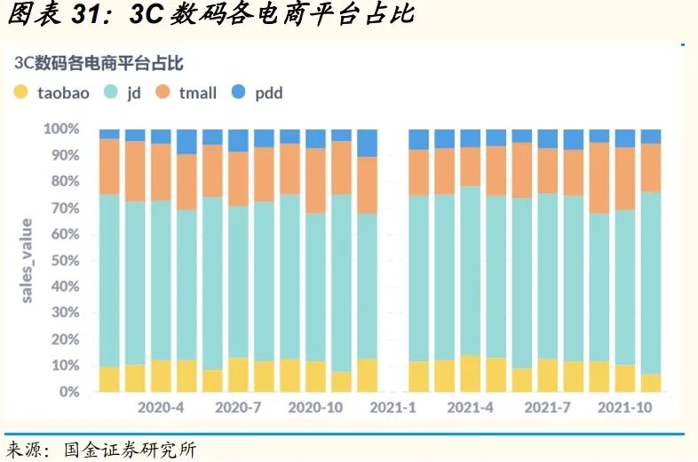 就3C数码品类来看,如下图,从京东平台销售的3C数码产品,占比四大平台的60%- 70%。