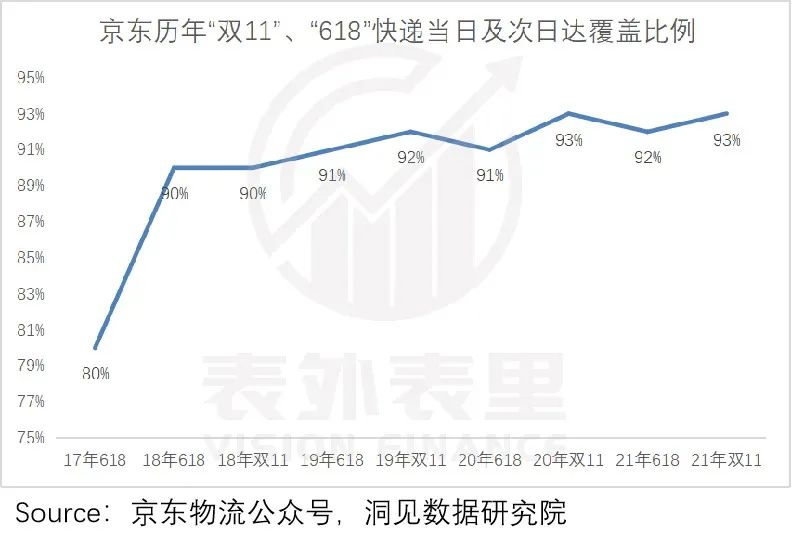 而数据显示,截至2020年底,京东自营的“211”战略(即上午11点前收到的所有订单将于当天配送,晚上11点前收到的订单将于次日下午3点前完成配送),已经覆盖全国90%以上的区县。