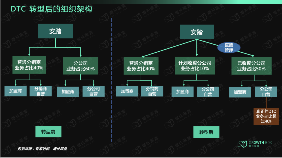 安踏的DTC转型其实是对内部组织结构的一次调整,将“左手”经销商的经营权换到集团“右手”,消化的是32个经销商里面的15家联营分公司直营门店的存量。