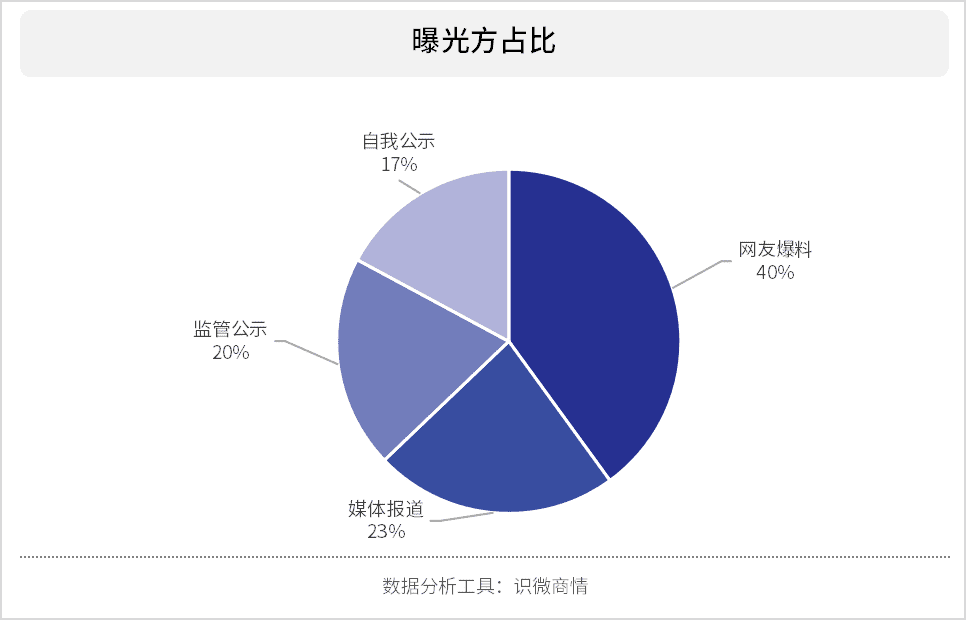 从舆情事件的曝光来看,主要为网友爆料、媒体报道、监管公示、自我公示四个来源。其中,网友成为最主要的曝光方,以14件事项占据了40%的比例。媒体报道排名第二,占比23%。监管公示排名第三,占比20%;近来,一些品牌行政处罚的公式容易被媒体进行挖掘并扩大报道形成舆情,而政务部门在新媒体渠道自分发也加大了食品行业负面舆情发酵的风险。企业自我公示占比最小,达17%。