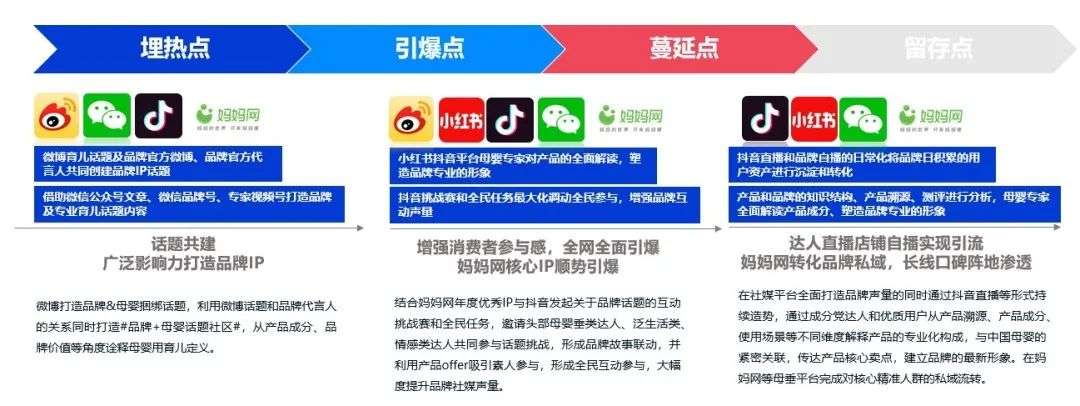 埋热点——结合微博育儿专题打造品牌专题页,创造品牌IP话题,利用代言人/明星/超头部达人的内容及跨平台传播实现心智蓄水。