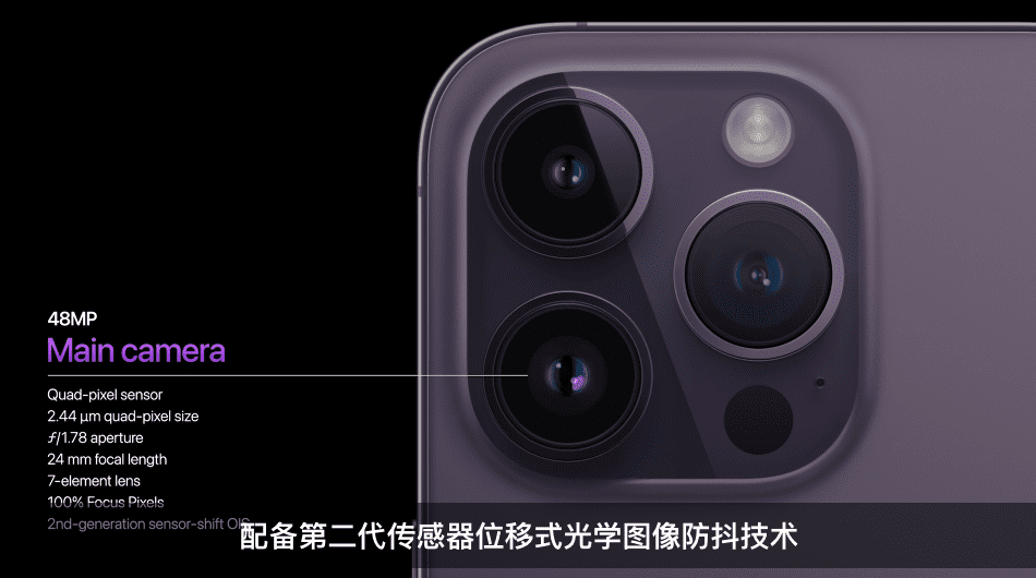 在摄像头上,iPhone 14 Pro 系列的广角主摄上,苹果舍弃了祖传的 1200 万像素,带来了 4800 万像素的广角主摄,支持四合一像素技术,24 毫米焦距,ƒ/1.78 光圈,还有第二代传感器位移式光学图像防抖功能。同时还搭载了全新 1200 万像素超广角摄像头(单位像素大小为 1.4 微米),呈现的图像更清晰、细节更丰富。
