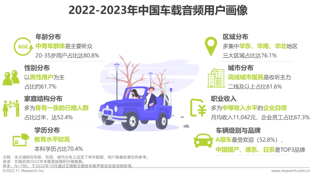 •用户特征:高学历中青年已婚人群是主要听众,日常生活、通勤、自驾游是最常见用车场景;