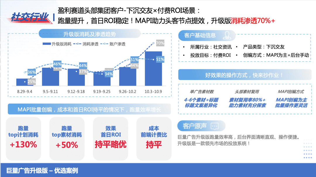 此外,还可以从素材视角进行调优,初期使用原版头部素材快速起量,后期保证所有素材升级版投放,验证效果后,建议升级版的基建量可达到原版的50%以上,以便快速起量。最后实现了升级版稳定渗透超60%。