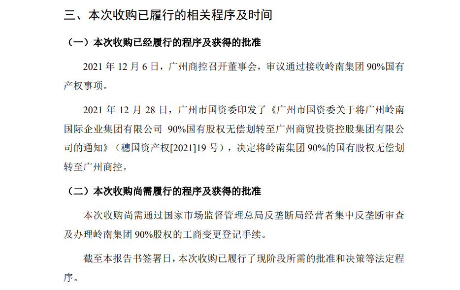 2022年1月5日,岭南控股(000524.SZ)发布《广州岭南集团控股股份有限公司收购报告书》,报告书称,此次收购是广州商控以国有资产无偿划转方式受让广州市国资委持有的岭南集团90%股权,收购完成后,广州商控将成为岭南控股的间接控股股东。
